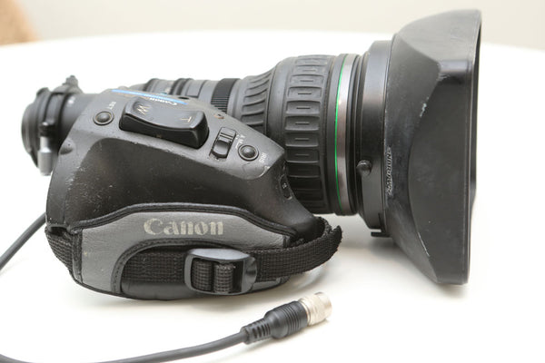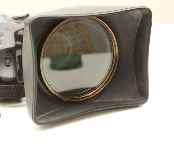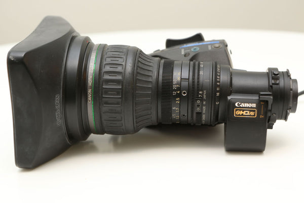 This is a used Premier Canon HJ21eX7.8B IRSD HD 2/3” lens in very good working condition, with minor scuffs on the zoom handle from normal use. It is designed for 2/3” HD cameras with a B4 mount, including models such as the PDW-F900, PDW-F800, AG-HPX500, AG-HPX600, AJ-HPX3000, AJ-HPX3700, PMW-350, PMW-500, AJ-PX800, and the Blackmagic URSA Broadcast G1 and G2. With the 2x extender engaged, it delivers a 42x optical zoom. As part of Canon’s eHDxs series, it provides excellent sharpness and image quality
